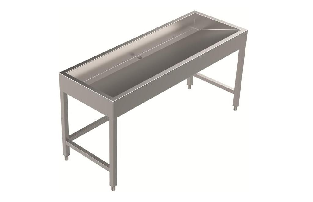 ohne.ohne eingearbeiteter Armaturen-/Ablagebank zur Verwendung von Stand- oder Wandarmaturen Rinne gekantet mit eingearbeitetem Gefälle zum mittigen Ablauf mit integriertem Ablaufsieb und Ventilunterteil 1 ½“ mit 3-seitig abgekanteter 150 mm hoher Schürze mit.Unterbau bestehend aus 4 Füßen aus Vierkantrohr, Nivellierfüßen und einer unter dem Beckenrand umlaufenden Verstrebung und einer unteren 3-seitigen Verstrebung aus Edelstahl vierkantrohr