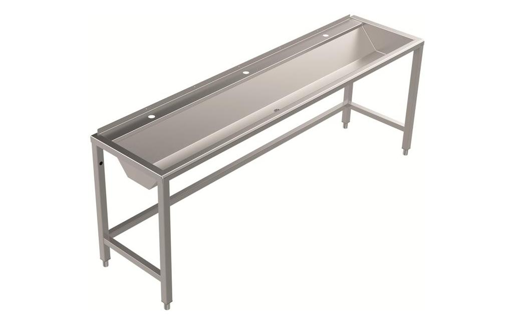 mit eingearbeiteter Armaturen-/Ablagebank zur Verwendung von Stand- oder Wandarmaturen Rinne gekantet mit eingearbeitetem Gefälle zum mittigen Ablauf mit integriertem Ablaufsieb und Ventilunterteil 1 ½“ mit 3-seitig abgekanteter 150 mm hoher Schürze mit.Unterbau bestehend aus 4 Füßen aus Vierkantrohr, Nivellierfüßen und einer unter dem Beckenrand umlaufenden Verstrebung und einer unteren 3-seitigen Verstrebung aus Edelstahl vierkantrohr