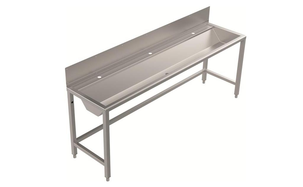 mit Spritzrückwand und eingearbeiteter Armaturen-/Ablagebank zur Verwendung von Stand- oder Wandarmaturen Rinne gekantet mit eingearbeitetem Gefälle zum mittigen Ablauf mit integriertem Ablaufsieb und Ventilunterteil 1 ½“ mit 3-seitig abgekanteter 150 mm hoher Schürze mit.Unterbau bestehend aus 4 Füßen aus Vierkantrohr, Nivellierfüßen und einer unter dem Beckenrand umlaufenden Verstrebung und einer unteren 3-seitigen Verstrebung aus Edelstahl vierkantrohr