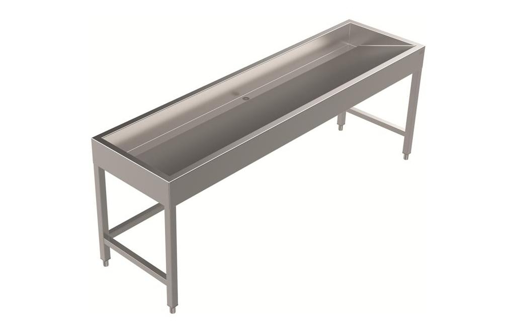 DREILICH Waschrinne 510 UB bodenstehend mit Unterbau ohne Armaturenbank zur Verwendung von Stand- und Wandarmaturen Abmessungen: 2400 x 150 x 570mm (B x H x T) Gesamthöhe: 850mm Material: 1.4301 CNS V2A