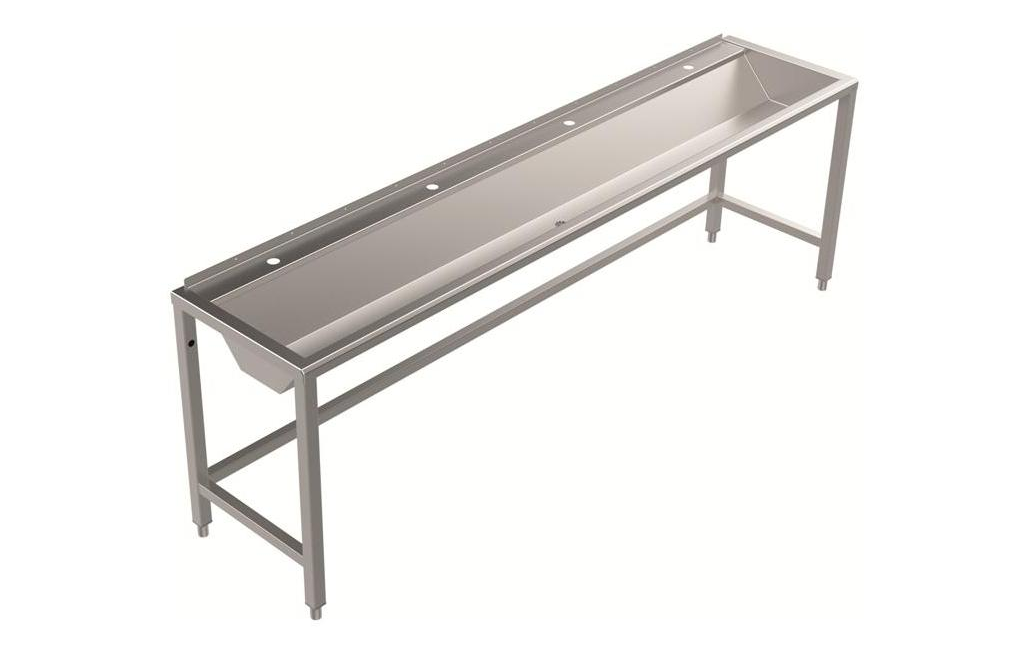 mit eingearbeiteter Armaturen-/Ablagebank zur Verwendung von Stand- oder Wandarmaturen Rinne gekantet mit eingearbeitetem Gefälle zum mittigen Ablauf mit integriertem Ablaufsieb und Ventilunterteil 1 ½“ mit 3-seitig abgekanteter 150 mm hoher Schürze mit.Unterbau bestehend aus 4 Füßen aus Vierkantrohr, Nivellierfüßen und einer unter dem Beckenrand umlaufenden Verstrebung und einer unteren 3-seitigen Verstrebung aus Edelstahl vierkantrohr