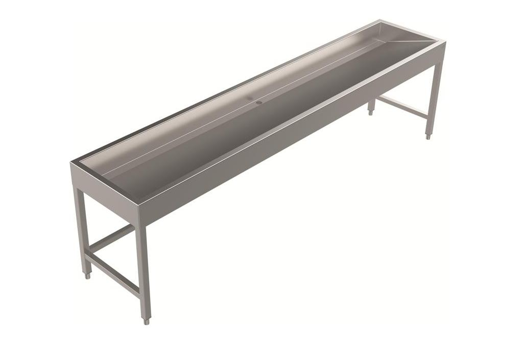 DREILICH Waschrinne 510 UB bodenstehend mit Unterbau ohne Armaturenbank zur Verwendung von Stand- und Wandarmaturen Abmessungen: 2400 x 150 x 570mm (B x H x T) Gesamthöhe: 850mm Material: 1.4301 CNS V2A