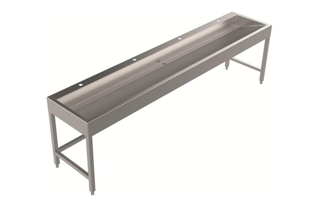 mit eingearbeiteter Armaturen-/Ablagebank zur Verwendung von Stand- oder Wandarmaturen Rinne gekantet mit eingearbeitetem Gefälle zum mittigen Ablauf mit integriertem Ablaufsieb und Ventilunterteil 1 ½“ mit 3-seitig abgekanteter 150 mm hoher Schürze mit.Unterbau bestehend aus 4 Füßen aus Vierkantrohr, Nivellierfüßen und einer unter dem Beckenrand umlaufenden Verstrebung und einer unteren 3-seitigen Verstrebung aus Edelstahl vierkantrohr