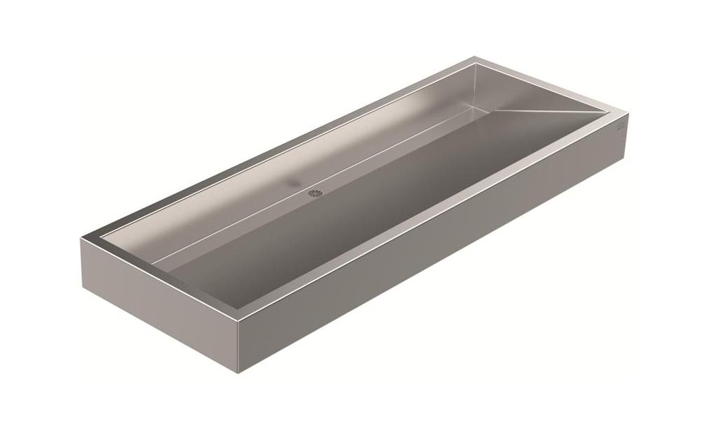 ohne.Armaturenbank zur Verwendung von Wandarmaturen Rinne gekantet schräg nach hinten verlaufend mit eingearbeitetem Gefälle zum mittigen Ablauf mit integriertem Ablaufsieb und Ventilunterteil 1 ½“ mit 3-seitig abgekanteter 150 mm hoher Schürze, mit stabilen angeformten Wandkonsolen und zusätzlicher Einhängeleiste ebenfalls aus Edelstahl gefertigt. Länge: 1200 mm