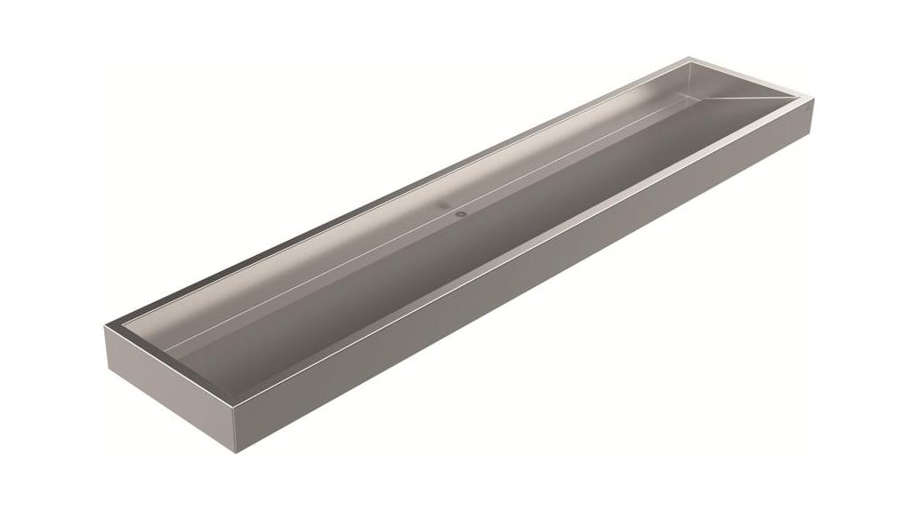ohne.Armaturenbank zur Verwendung von Wandarmaturen Rinne gekantet schräg nach hinten verlaufend mit eingearbeitetem Gefälle zum mittigen Ablauf mit integriertem Ablaufsieb und Ventilunterteil 1 ½“ mit 3-seitig abgekanteter 150 mm hoher Schürze, mit stabilen angeformten Wandkonsolen und zusätzlicher Einhängeleiste ebenfalls aus Edelstahl gefertigt. Länge: 1200 mm