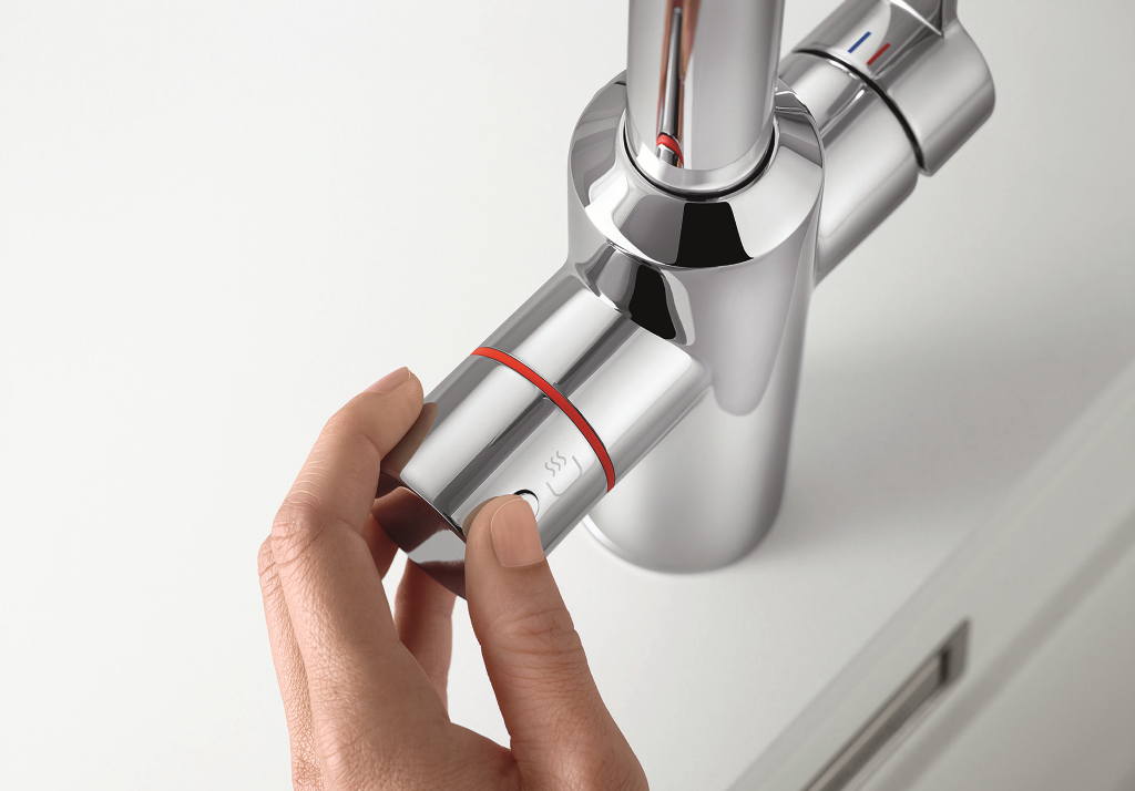 Vor allem die Option auf sofort kochend heißes Wasser ohne jegliche Wartezeit ist ein unschlagbarer Vorteil, denn sie spart wertvolle Zeit. Die Armatur wird über einen separaten Heißwasser-Drehknopf mit Sicherheitsriegel gesteuert. Nach jeder Bedienung springt der Drehknopf sofort in die Ausgangsstellung zurück, was für maximale Sicherheit sorgt.