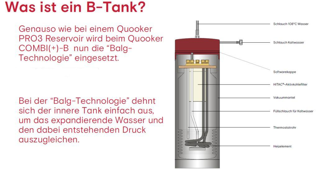 Denn dieses Reservoir hat Platz für Expansionswasser, weil die Kesselwand aus Edelstahl flexibel ist. Ein Teil des Reservoirs ist als Balg konzeptioniert, der sich bei jedem Aufheizen des Wassers etwas ausdehnen kann. Sobald Wasser abgezapft wird, schrumpft der Balg in seine Ausgangsposition zurück und ist wieder bereit, frisches Leitungswasser aufzuheizen.