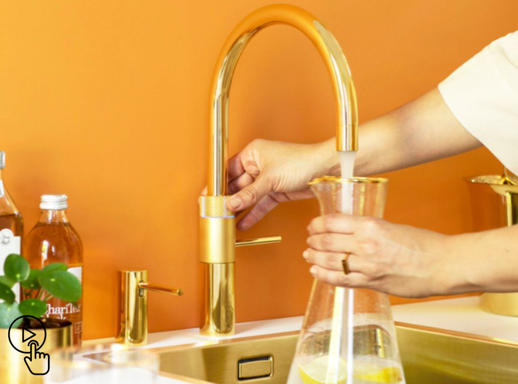 Der Fusion Gold mit einer Schicht aus 24 Karat Gold bringt sofort Glanz auf Ihre Arbeitsplatte. Er ist eine Mischbatterie und ein Kochend-Wasserhahn in einem, der in Kombination mit dem CUBE von Quooker auch gekühltes, gefiltertes sprudelndes und stilles Wasser gibt.