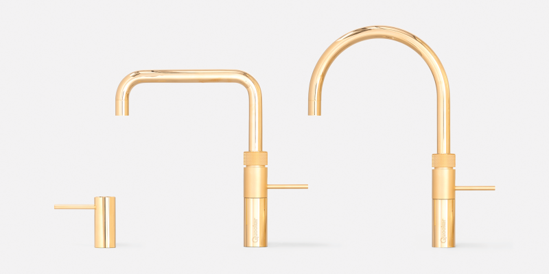 Der Quooker Gold ist als Fusion Square, Fusion Round sowie als Mischbatterie mit schlicht geradem oder zierlich rundem Auslauf erhältlich. Der Kopf der Mischbatterie ist in Mattgold ausgeführt, was dem Hahn einen dezenten Touch verleiht. Auch der Seifenspender ist passend in vergoldeter Ausführung erhältlich. Der Quooker Gold wird mir PRO3-, COMBI- oder COMBI+-Reservoir für die Montage unter der Arbeitsplatte geliefert.