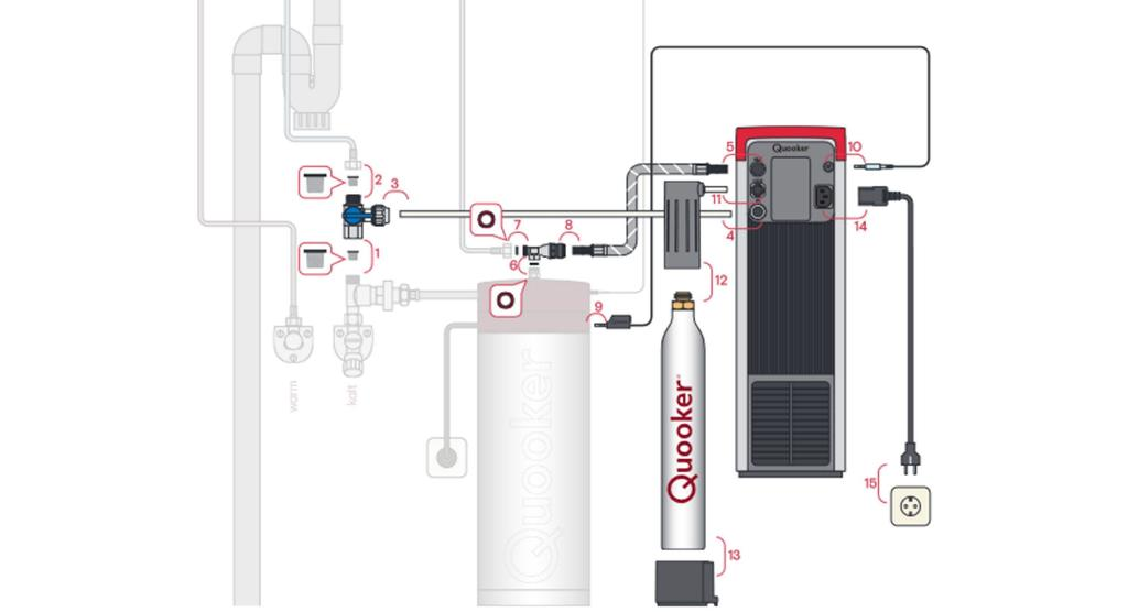 Der CUBE kann einfach an das Quooker-Reservoir und an die Kaltwasserleitung angeschlossen werden. Gekühltes Wasser wird im CUBE gespeichert. Es gibt zwei Filter, die das Wasser reinigen. Am Reservoir ist ein CO₂-Zylinder (eine Flasche mit Kohlensäure) für Sprudelwasser. Der CUBE kann mit jeder Art von Quooker-Hahn kombiniert werden. Welchen Hahn Sie wählen, bleibt Ihnen überlassen. Wird es der Fusion sein, mit einem runden oder einem geraden Hahnauslauf? Der Flex mit seinem handlichen, Zugauslauf ? Oder entscheiden Sie sich
