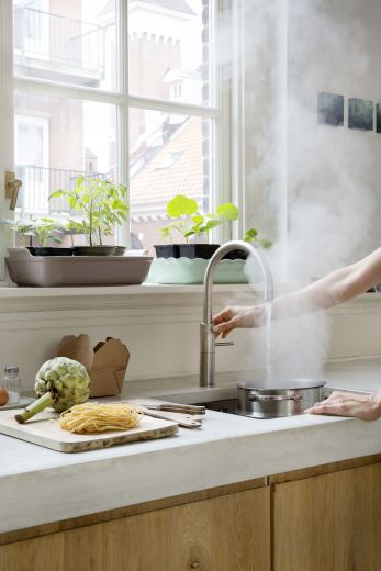 Ein Quooker besteht aus zwei Teilen: dem Kochend-Wasserhahn auf der Arbeitsplatte und einem kleinen Reservoir darunter, in dem das Wasser bei 110° C gespeichert wird. Erfahren Sie mehr darüber, wie das Quooker-System funktioniert.