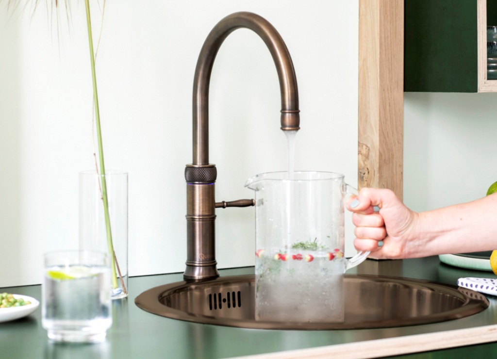 Mit dem Quooker CUBE erhalten Sie neben 100°C kochendem Wasser auch gekühltes sprudelndes und stilles Wasser aus dem Quooker-Hahn.