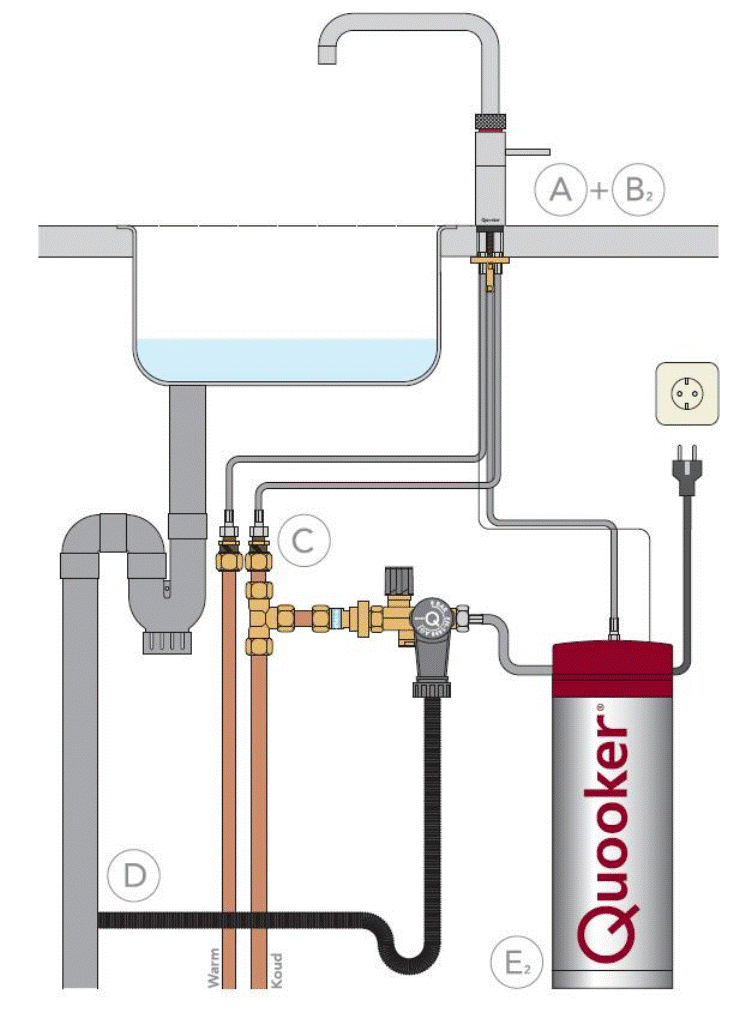 Ein Quooker-System besteht aus einem Hahn auf der Arbeitsfläche und einem Reservoir für kochendes Wasser (100°C) unter der Arbeitsfläche. Das Reservoir ist hochvakuumisoliert, sodass die Wärme nicht entweichen kann. Daher ist nur sehr wenig Energie notwendig (10 Watt), um das Wasser im Reservoir auf einer Temperatur von 108°C vorrätig zu halten. Das Reservoir wird an die Wasserleitung angeschlossen. Bei Entnahme des kochenden Wassers strömt unter der Arbeitsplatte sofort frisches Wasser in das Reservoir nach.