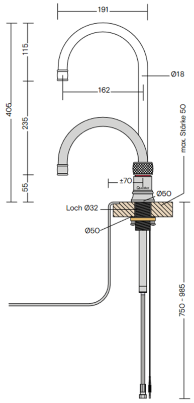 Maße: siehe Installationsanleitung (abweichende Modellabbildung)Technische Besonderheiten Modell: QUOOKER NORDICDoppelwandiger Auslauf, dessen Außenseite so kühl bleibt