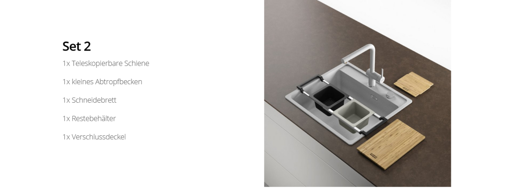 Im Angebot sind fünf Sets unterschiedlichen Umfangs. Dazu gehört etwa ein großes Holzschneidebrett aus Bambus oder eine mobile Abtropfmatte aus Silikon. Besonders raffiniert: In die teleskopierbaren Schienen lassen sich je nach Bedarf spezielle Elemente einhängen – etwa Abtropfbecken unterschiedlicher Größe, Auffangschalen aus schwarzem, mit