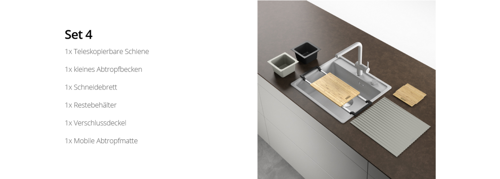 Im Angebot sind fünf Sets unterschiedlichen Umfangs. Dazu gehört etwa ein großes Holzschneidebrett aus Bambus oder eine mobile Abtropfmatte aus Silikon. Besonders raffiniert: In die teleskopierbaren Schienen lassen sich je nach Bedarf spezielle Elemente einhängen – etwa Abtropfbecken unterschiedlicher Größe, Auffangschalen aus schwarzem, mit
