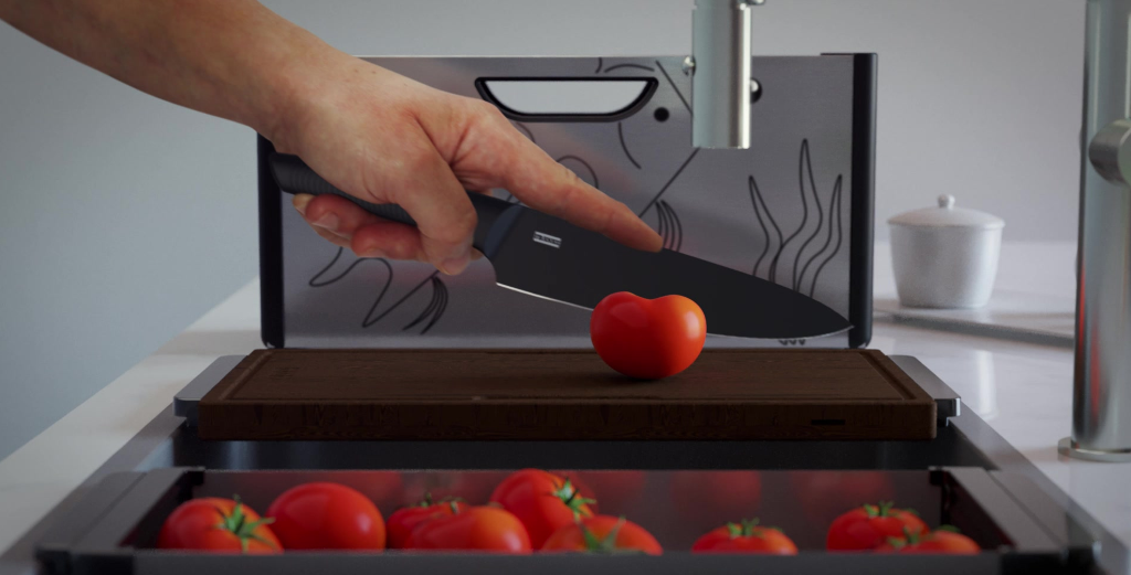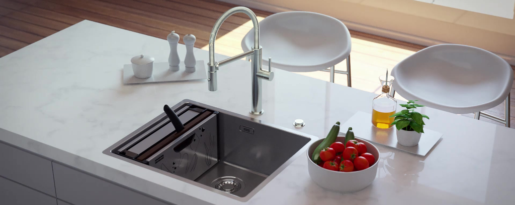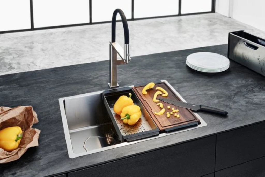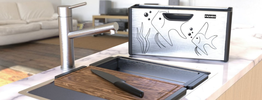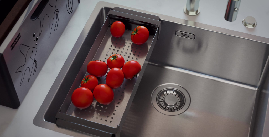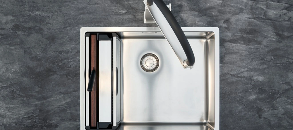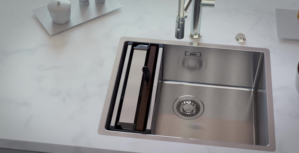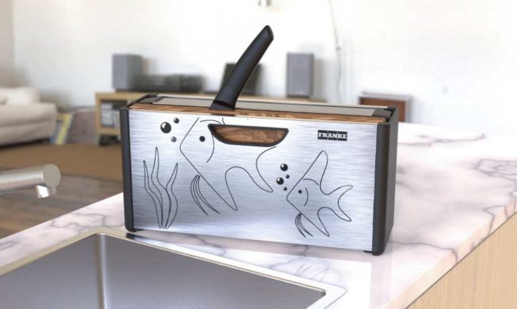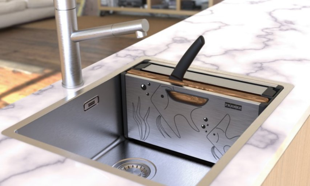 FRANKE ANDY CHEF - Designstarker Küchenassistent Zubehörbox inkl. Schneidbrett, Kochmesser und Abtropfbecken Abmessungen: 133 x 200 x 408mm (B x H x T)