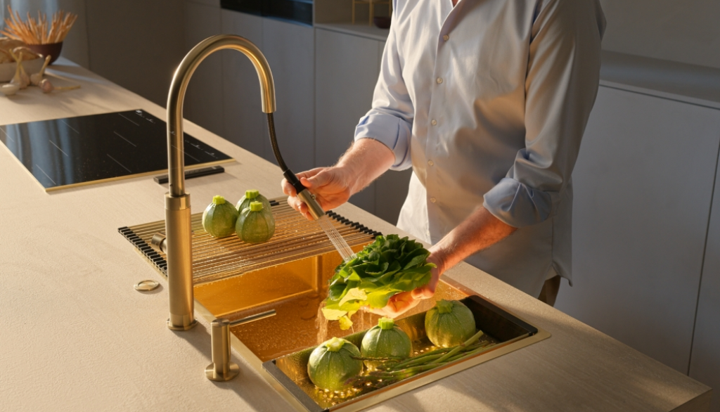 zur Montage in die Arbeitsplatte oder Spüle bequeme Druckbetätigung nachfüllbar von Oben Material: Edelstahl massiv Oberfläche: Gold