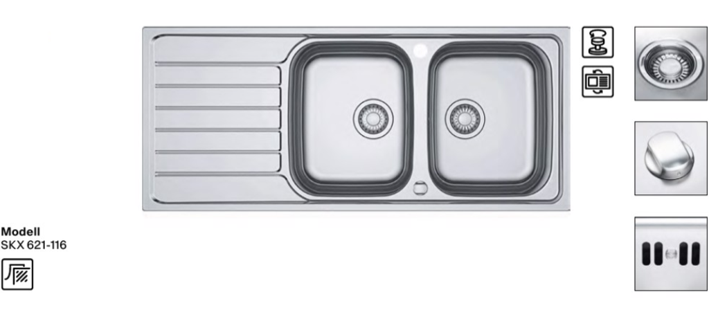 Edelstahlspüle mit 2 Becken reversibel Außenmaße 1160x500mm Beckentiefe 160/160mm