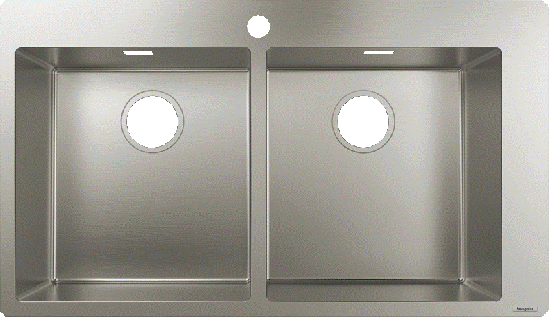 Wer gern mehrere Arbeitsschritte parallel erledigt, wird hansgrohe Doppelspülen lieben: Während Sie im kleinen Becken (180 mm Breite) Gemüse waschen, befüllen Sie im großen Becken (450 mm Breite) den vorgesehenen Kochtopf. Hantieren Sie regelmäßig mit großen Gefäßen oder Backformen, bietet sich die Variante mit zwei großen Becken an (je 370 mm Breite).