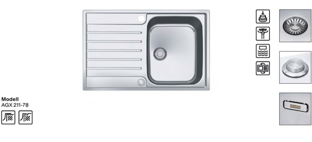 Edelstahlspüle mit Druckknopfventil reversibel Oberfläche: Edelstahl poliert Außenmaße: 780x510mm