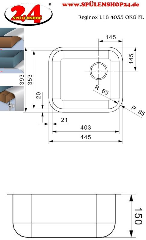 Edelstahlspüle mit Flachrand Außenmaße 445x393mm Beckentiefe 150mm
