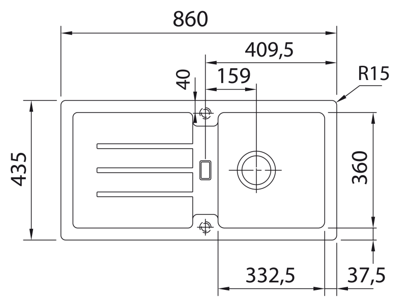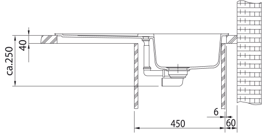 KERAMIK-Spül-Modul / Spülstein Außenmaße:595±5mmx625±1mm Beckenabmessungen:545x365/315x165mm Achtung: Nur zur Montage zwischen zwei Schränken geeignet Die bearbeitete Rückseite ist nicht geschlossen Überstand variiert abhängig vom Möbelhersteller Bei 600mm Arbeitsplatte (kann bis auf 775mm vergrößert werden) für Unterschränke ab Breite