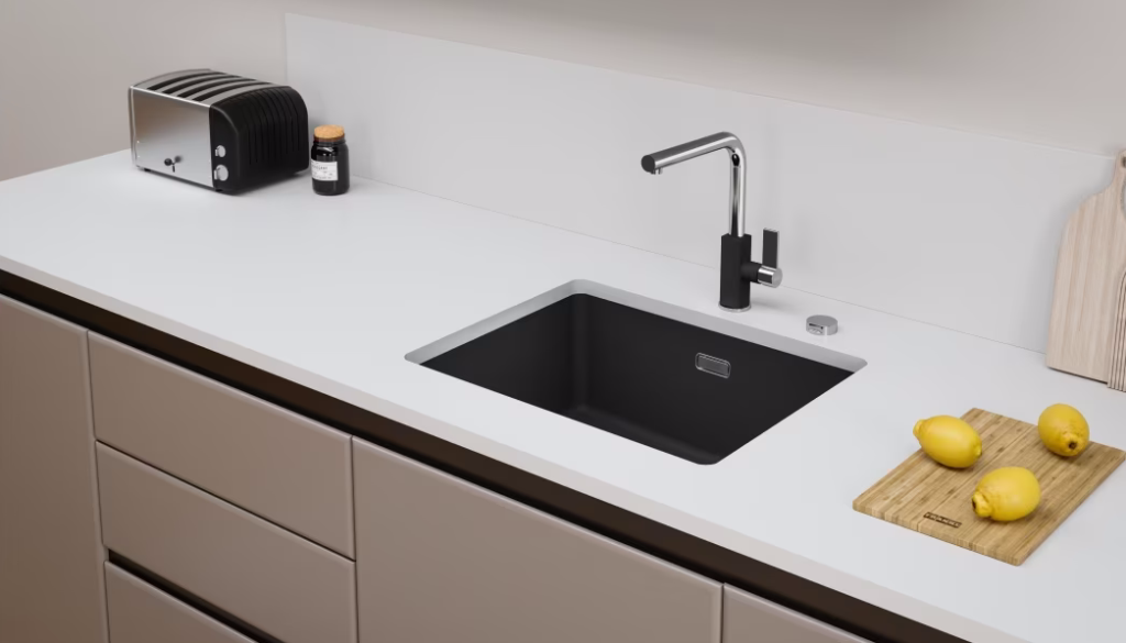 Granitspüle / Einbauspüle mit Drehknopfventil Black Matt - Black Collection für die flächenbündige Montage Küchenspüle aus Fragranit+ Außenmaße: 581.5x501.5mm