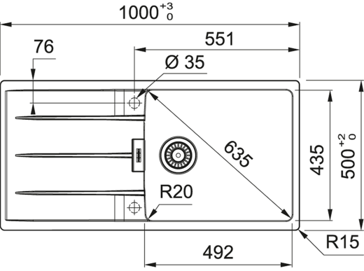 Einbauspüle mit Drehexcenter reversibel EXTRA starkes Material Außenmaße: 860x480mm
