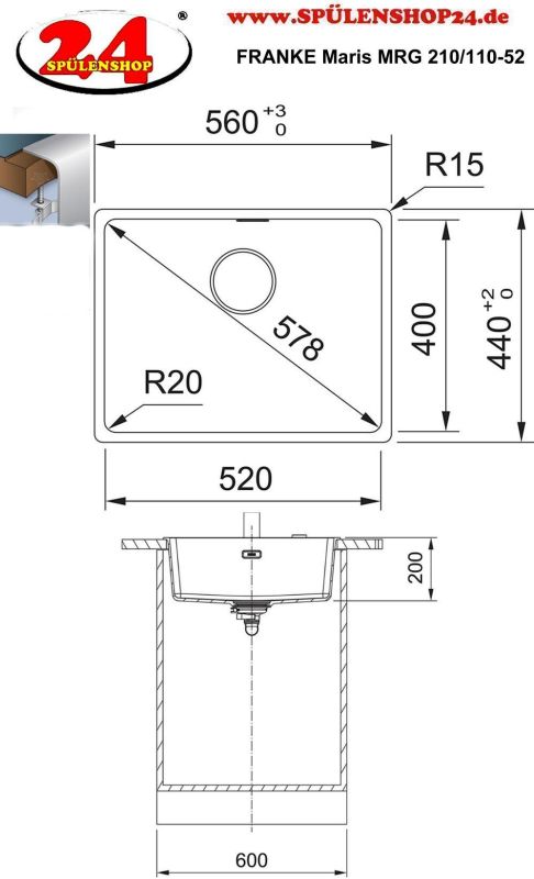 Nano Granitspüle aus Quarzkomposit Spüle mit Drehexcenter Außenmaße 780x500mm Spülbecken EXTRATIEF 198mm