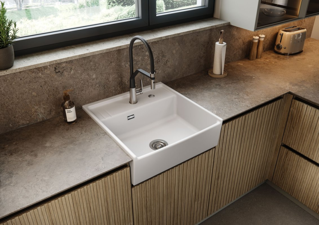 KERAMIK-Spül-Modul / Spülstein Außenmaße:595±5mmx618±1mm Beckenabmessungen:560x415mm Achtung: Nur zur Montage zwischen zwei Schränken geeignet Die bearbeitete Rückseite ist nicht geschlossen Überstand variiert abhängig vom Möbelhersteller für Unterschränke ab Breite