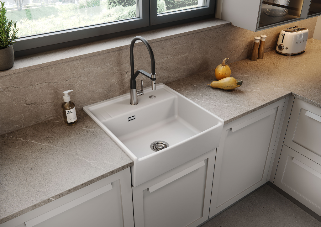 KERAMIK-Spül-Modul / Spülstein Außenmaße:895±5mmx618±1mm Beckenabmessungen:860x415mm Achtung: Nur zur Montage zwischen zwei Schränken geeignet Die bearbeitete Rückseite ist nicht geschlossen Überstand variiert abhängig vom Möbelhersteller für Unterschränke ab Breite