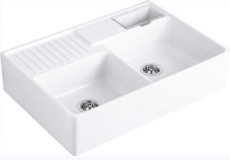 KERAMIK-Spül-Modul / Spülstein Außenmaße:895±5mmx625±1mm Beckenabmessungen:505x365/315x360mm Achtung: Nur zur Montage zwischen zwei Schränken geeignet Die bearbeitete Rückseite ist nicht geschlossen Überstand variiert abhängig vom Möbelhersteller Bei 600mm Arbeitsplatte (kann bis auf 775mm vergrößert werden) für Unterschränke ab Breite