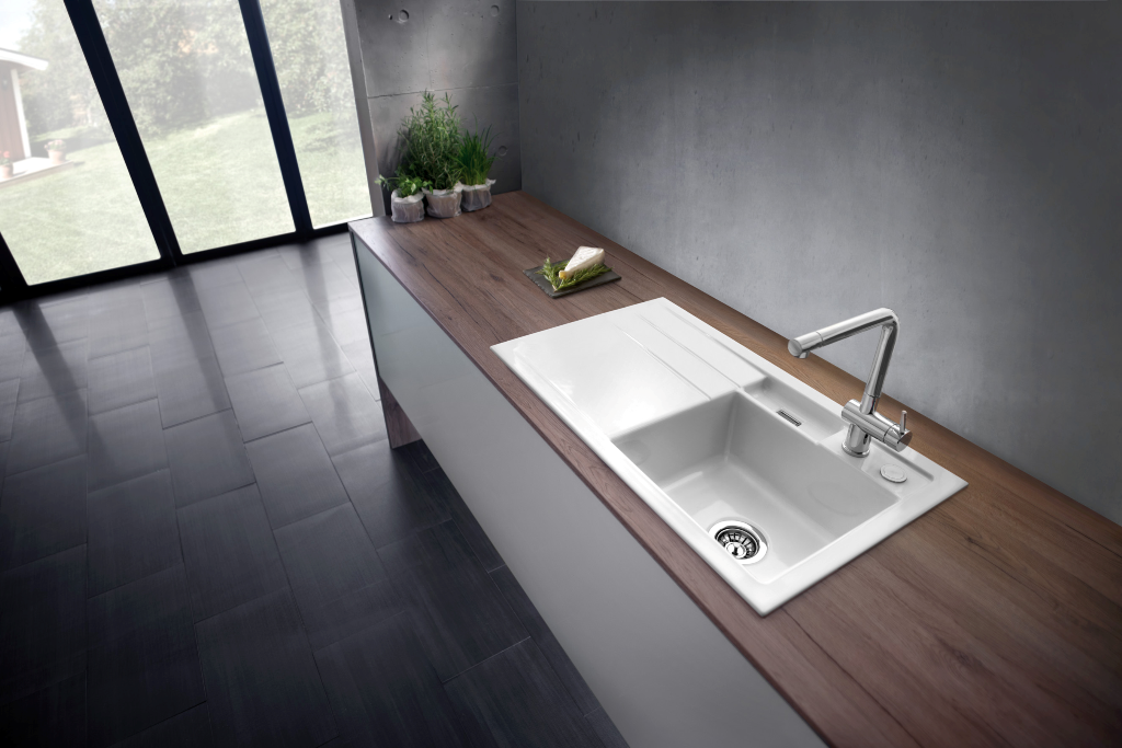 KERAMIK-Einbauspüle mit Handbetätigung Beckenposition wählen! Beckenabmessungen: 495* x 340*mm Außenmaße: 1000mm±1,5% x 510mm±1,5% Ausschnittsmaß in der APL: Breite 970 x Tiefe 480mm für Unterschränke ab Breite