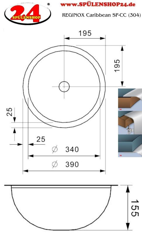 Edelstahl-Waschbecken mit Flachrand Spülen-Serie: Clean & Care (-CC-) Beckentiefe: 155mm