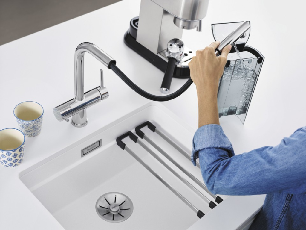 Smartness in jeder Hinsicht. BLANCO FONTAS liefert drei Optionen: warmes, kaltes sowie gefiltertes kaltes Wasser. Durch den integrierten BWT Mehrstufenfilter reinigt die Armatur das Wasser, reduziert Kalk sowie den Gehalt an Schwermetallen und verfeinert auf diese Weise spürbar den Geschmack. Macht 3 in 1 in einer Armatur. BLANCO FONTAS-S II Filter glänzt darüber hinaus mit dem herausziehbaren Auslauf für Kalt- bzw. Warmwasser und gefiltertes Wasser. Dieser Auslauf ermöglicht eine flexible Handhabung rund um das Spülbecken. So lassen sich Haushaltsgeräte wie z. B. Wasserkocher oder der Vorratstank einer Kaffeemaschine bequem mit gefiltertem Wasser befüllen. Eine frische Lösung, die man schmeckt. Die beiden separaten Bedienhebel für Kalt- bzw. Warmwasser auf der rechten Seite und gefiltertes Wasser auf der linken Seite sorgen dafür, dass man immer genau das Wasser zapfen kann, das man gerade möchte.