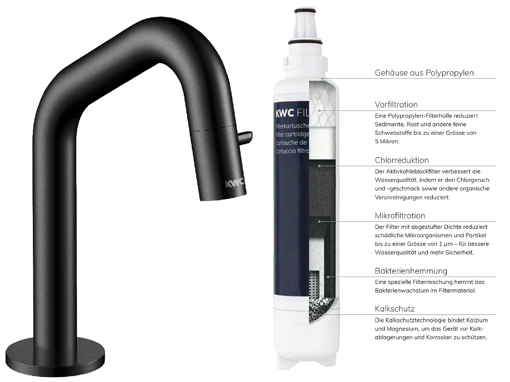 Einhebelmischer mit Filterfunktion PurifiedWater - Filtertechnologie  Filterwasser in getrennter Wasserführung Material: Edelstahl massiv Molybdän Oberfläche: Industrial Black